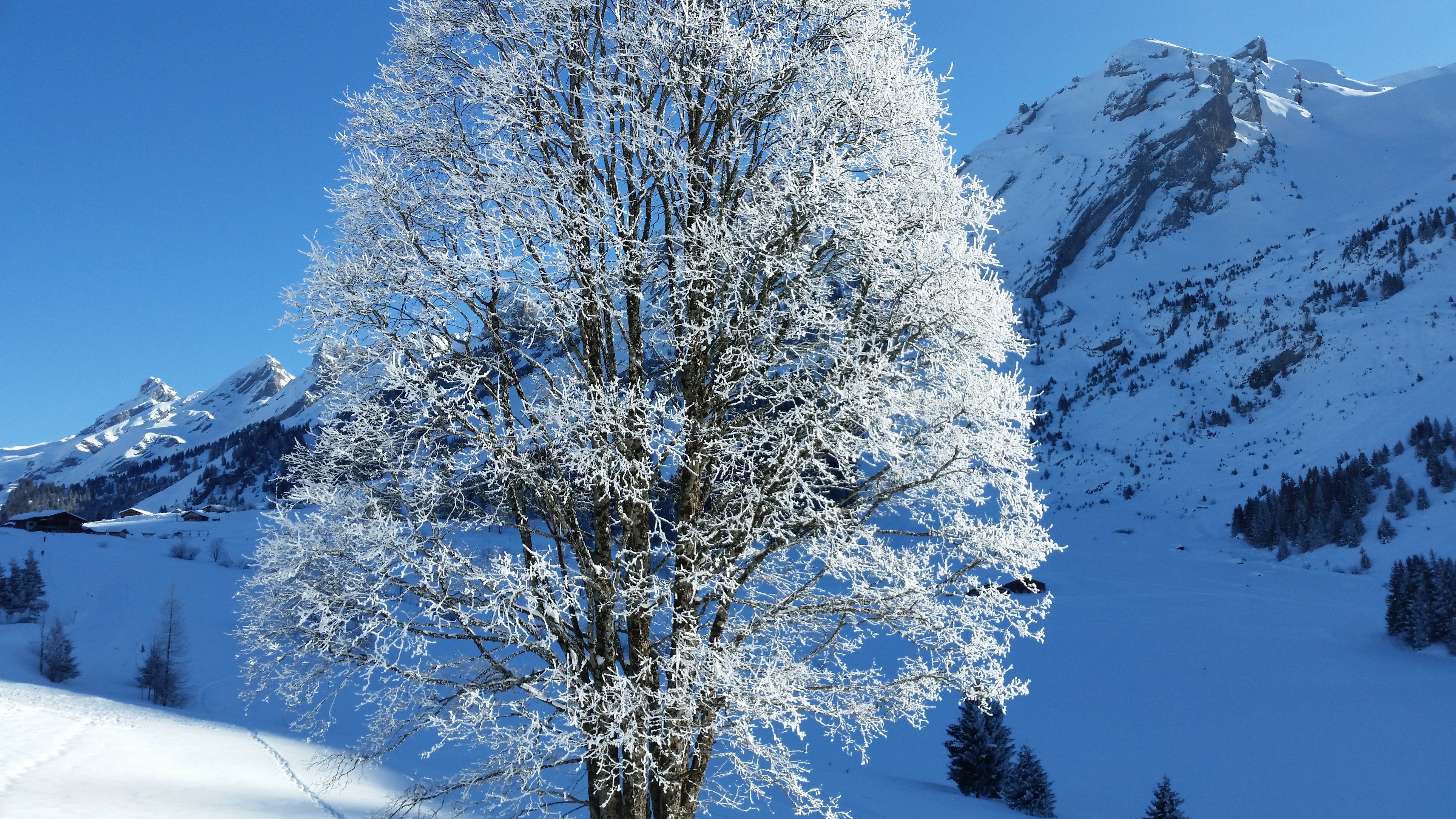 Vint alors l’épiphanie hivernale, comme une grande déchirure blanche et bleue qui écarte le voile grisâtre de l’hiver morose. Sous la dentelle des Aravis, le brouillard et le gel franc de la nuit ont orné les branches dépouillées d’une parure givrée, qui distille la lumière sous l’ombre des sommets.