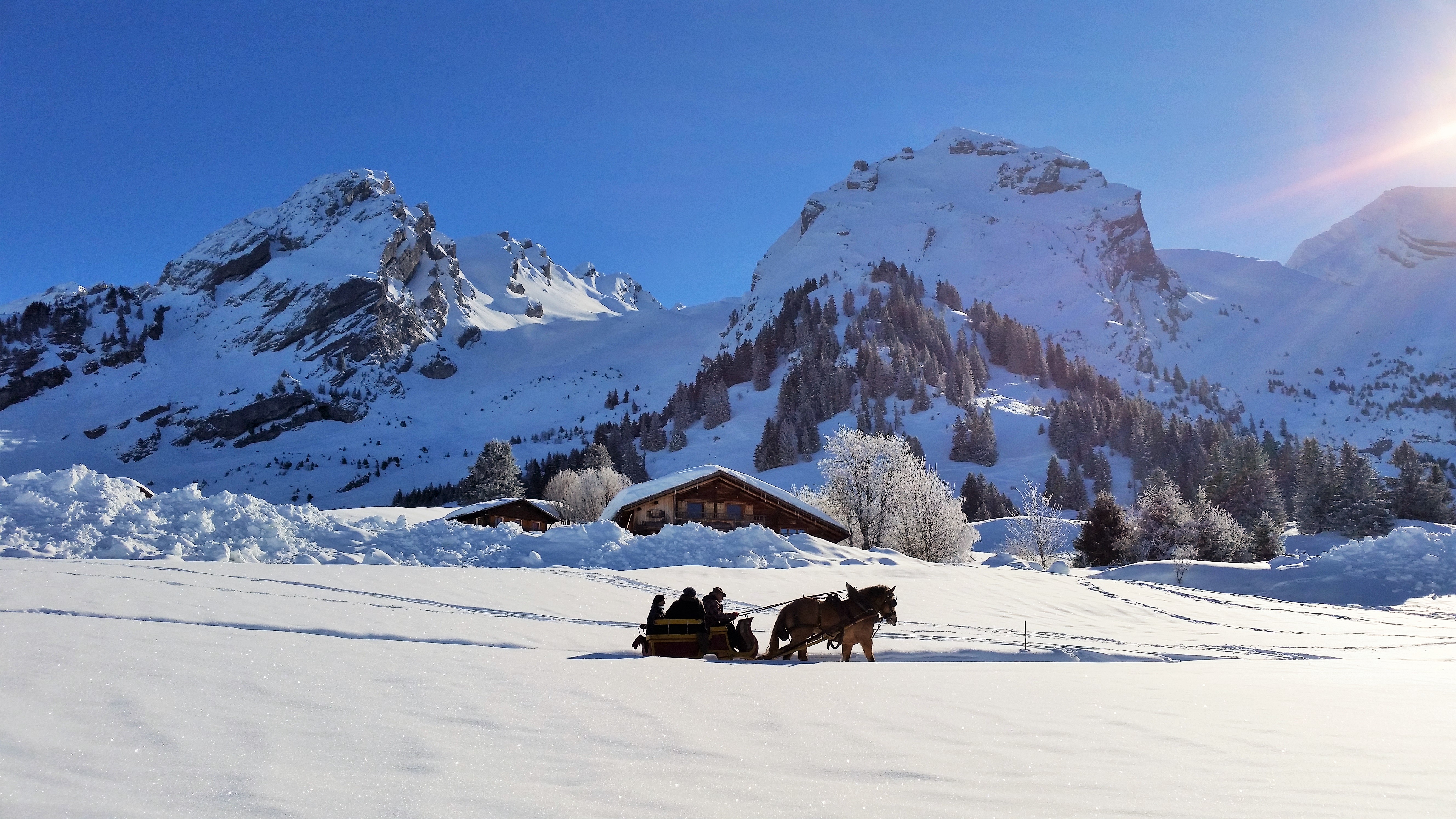 Un traîneau glisse au pas lent du robuste cheval dévoué à son fardeau.