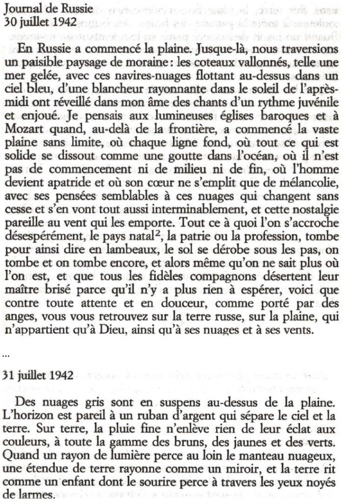 Il y a quelques années, j’ai passé un morceau d’été dans un coin perdu de la campagne russe, qui était situé sur la ligne de front, figée une bonne partie de l’année 1942, correspondant à l’avancée maximale de l’armée allemande. Et j’ai vu cette campagne, entre terre et ciel, comme Hans Scholl l’avait vue, un horizon illimité sous un ciel floconneux et lumineux. C’était sur le cours supérieur de la Volga, près d’un village tranquille surplombant le confluent du fleuve et d’une rivière limpide. Ce village, Dubrovki, est situé une dizaine de kilomètres en aval d’une petite ville, Staritsa, là où, entre Rjev et Tver (cette dernière ville appelée Kalinine durant la période soviétique), la Volga, encore fleuve modeste, coule langoureusement et provisoirement vers le nord-est, entre des rives herbues et surélevées, presque tracées au cordeau à proximité des villages, ou bien en empruntant une tranchée davantage forestière et sauvage dans les zones isolées. Le fleuve, au débit lent mais déjà nourri, et les nuages, toujours changeants, défilent en accord intime.