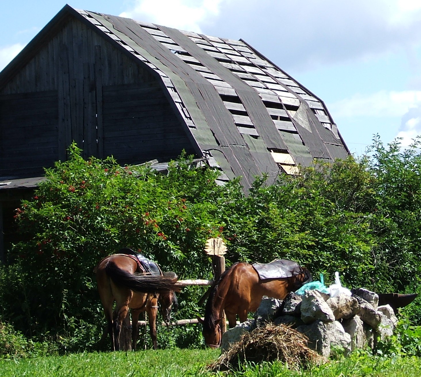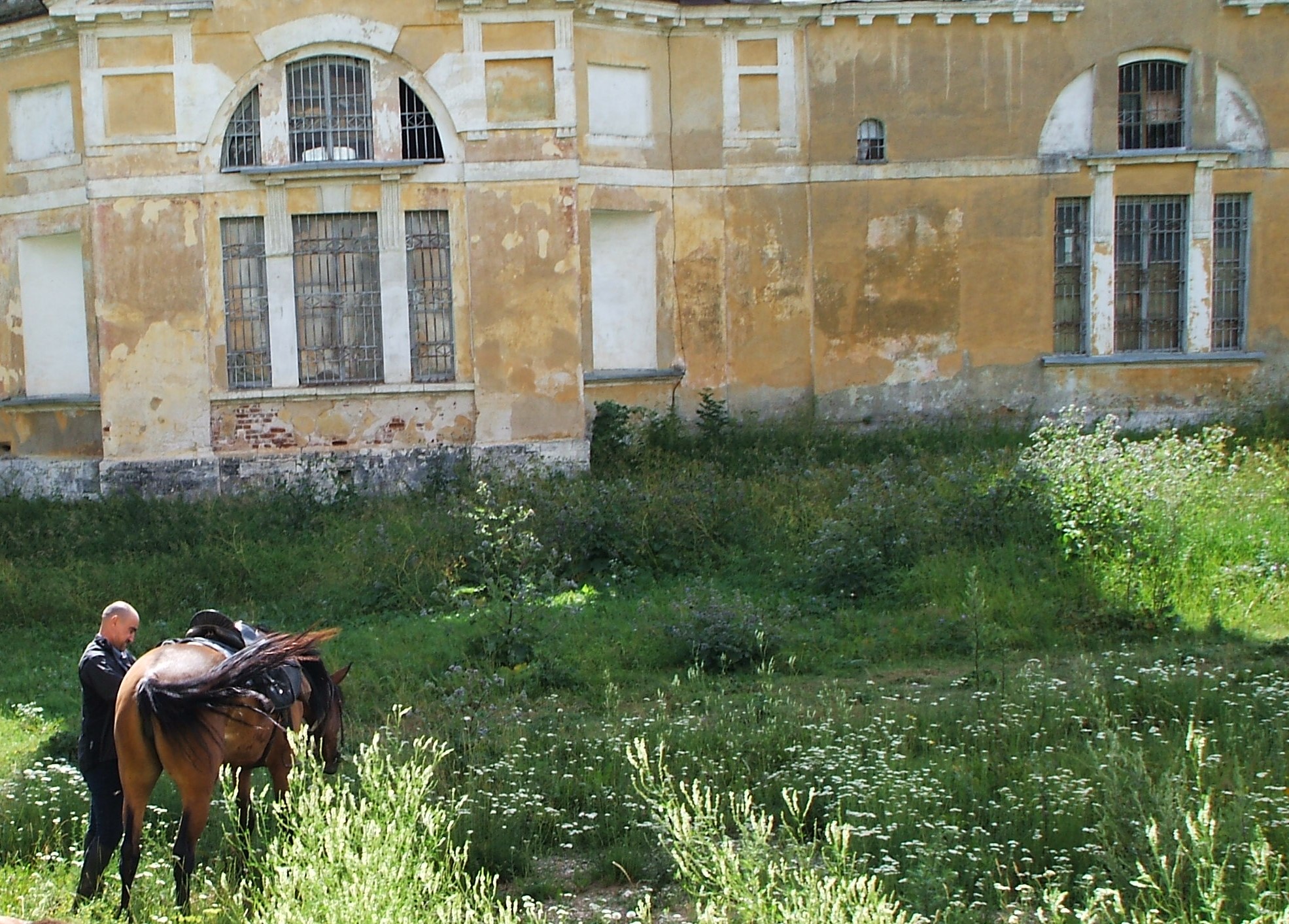 Nous étions logés dans une maison d’hôtes, entre datcha et isba, dont l’organisation et les rythmes gardaient l’esprit communautaire si ancré dans l’histoire russo-soviétique. Nous avions des chevaux à disposition, des montures robustes et impavides, contentes de battre la campagne sans trop d’itinéraires prédéterminés, en l’absence de cartes utilisables et au gré des humeurs du jour, avec la Volga comme axe de référence, pour ne pas s’égarer au cours de ces libres chevauchées, dont les parcours improvisés alternaient de manière répétée entre bosquets, champs et prairies. La déprise agricole, après la débandade de l’agriculture collective, laissait la flore sauvage prendre le dessus. Le flâneur équestre rêvasse aux possibles qui flottent dans la vie comme les nuages dans le ciel russe. Passant au galop pour prendre à travers champs, nous dérangions les cigognes, en envol groupé. De calmes hameaux, composés d’isbas disparates mais coquettes, éparpillées entre les habituelles palissades de bois, rompaient la monotonie. Eglises et cimetières à l’abandon témoignaient cependant d’une vie antérieure qui s’en était allée. Un jour, le maître de maison nous gratifia d’une expédition en télègue jusqu’au bourg plus étendu de Pankovo. Tchékhov n’était pas loin.