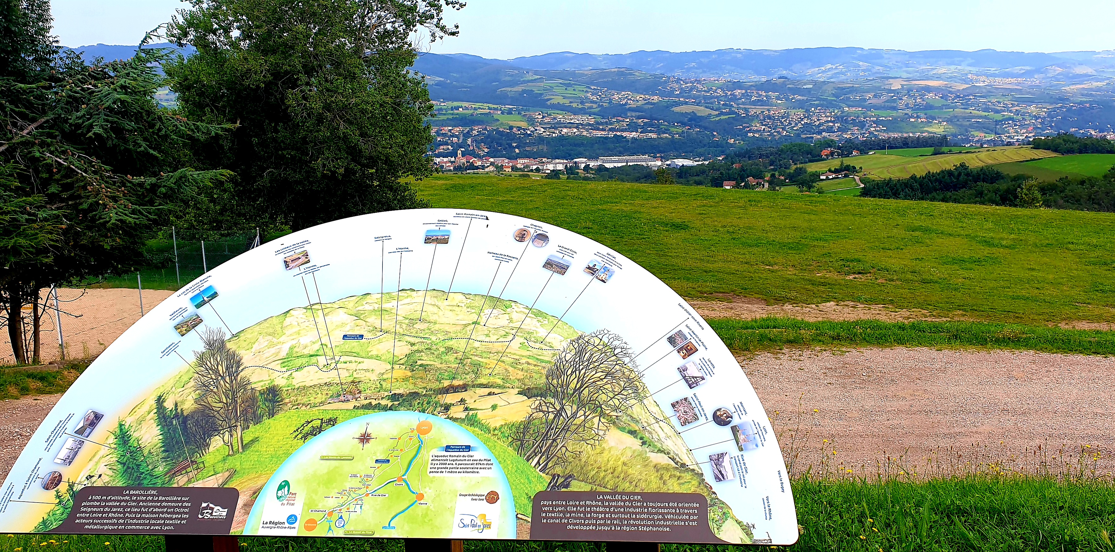 Le périple commence depuis les coteaux, premiers contreforts du massif du Pilat, qui dominent, à une altitude de 500 mètres, Saint-Chamond et la vallée du Gier, modeste rivière qui descend vivement du massif avant d’aller confluer plus calmement avec le Rhône (mais le Gier a ses humeurs dévastatrices). Le domaine de la Barollière, à Saint-Paul-en-Jarez, fut demeure des seigneurs du Jarez et octroi entre Loire et Rhône puis devint, plus tard, lieu de résidence d’industriels du textile et de la métallurgie. Depuis cette époque, la vallée du Gier a perdu de sa superbe industrielle mais gagné en verdeur. Le temps n’est plus où Jules Vallès, qu’on retrouvera du côté du Velay, s’exprimait ainsi quand il était « l’enfant » quittant le sillon houiller et industriel évasé qui court de Rive-de-Gier à Firminy en passant par Saint-Etienne : « C’est ici que je sors du pays du charbon avec ses usines aux pieds sales, ses fourneaux au dos triste, les rouleaux de fumée, la crasse des mines, un horizon à couper au couteau, à nettoyer à coups de balai… »[3]. J’ai connu un bassin stéphanois, mon lieu d’enfance et de prime jeunesse, qui ressemblait encore fort, dans les années 1950 et 1960, à cette description datant d’un siècle plus tôt, avant que les restructurations minières et industrielles engagées dans les années 1970 ne défassent peu à peu ce paysage ingrat. Saint-Etienne, ex-ville noire, revêt, comme il se doit, des atours de ville verte, mais l’agglomération stéphanoise et ses paysages conservent de ce passé des cicatrices indélébiles, comme autant de marques honorables de cette gloire industrielle. Depuis Saint-Paul-en-Jarez, le regard se perd, au nord de la vallée, dans les monts doucement bosselés du Lyonnais. Côté sud, la ligne sommitale du Pilat, avec les deux crêts de la Perdrix et de l’Oeillon, est bien visible. Nous amorcerons par ces monts du Pilat l’itinéraire qui nous conduira aux Cévennes encore lointaines. Le Pilat pointe comme un cap s’incrustant entre les vallées de la Loire et du Rhône, ici voisines, et nous allons pénétrer le continent des hautes terres qui s’élargit au sud de ce cap.