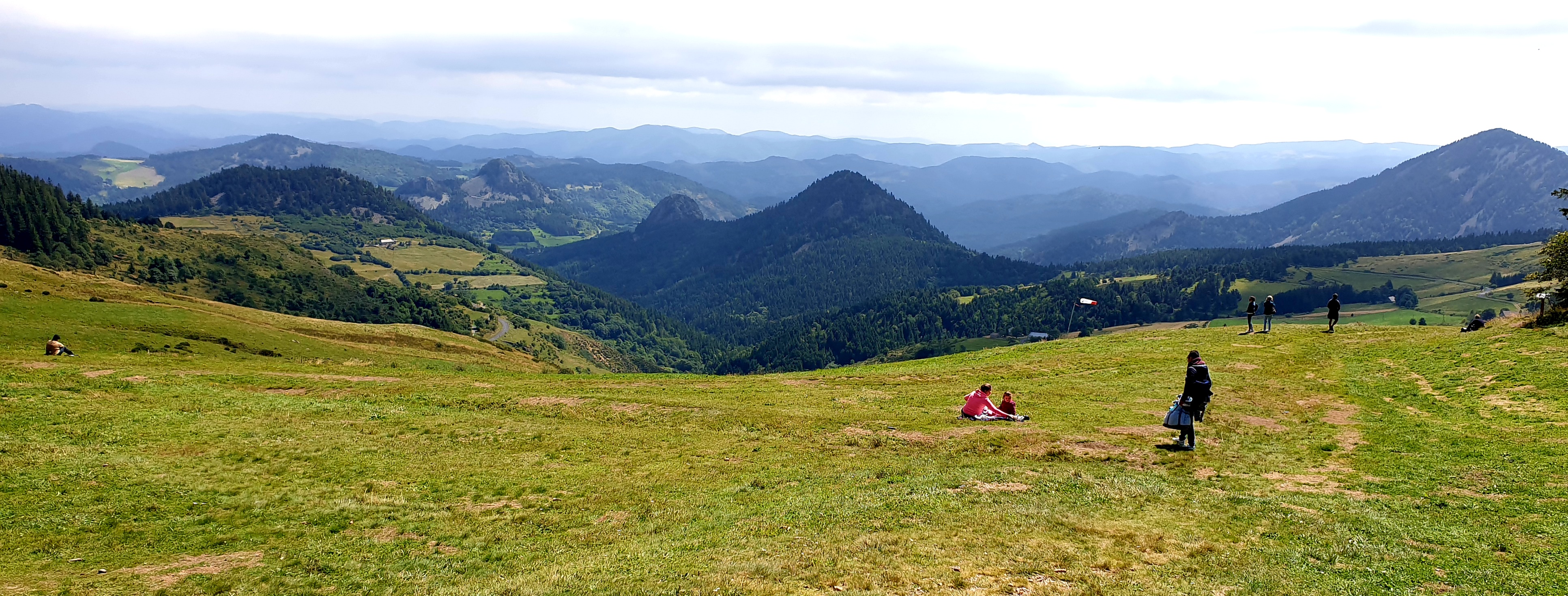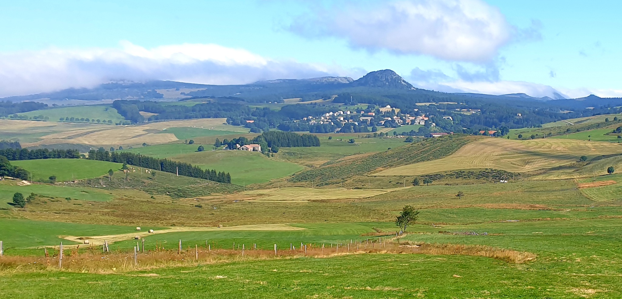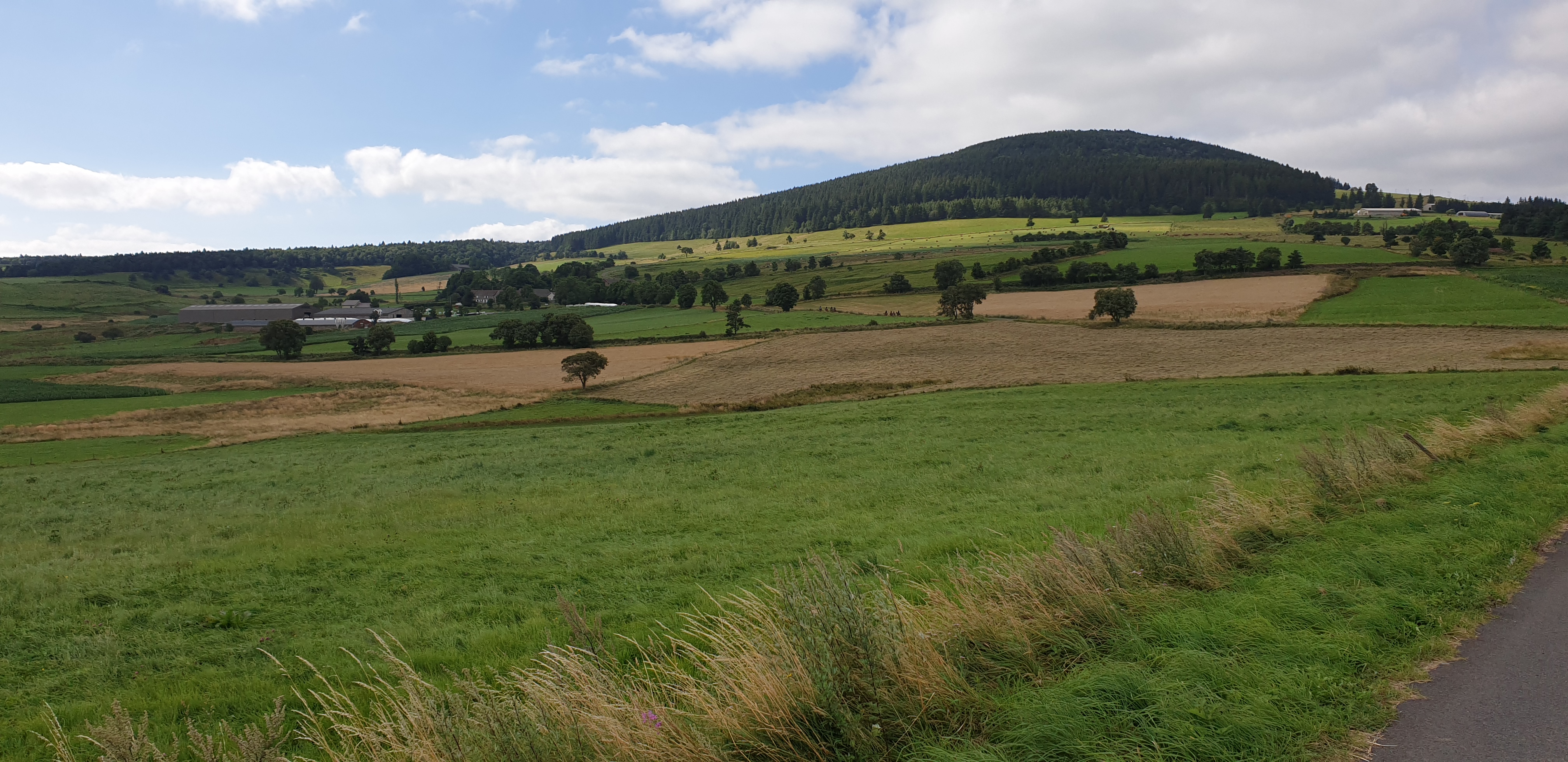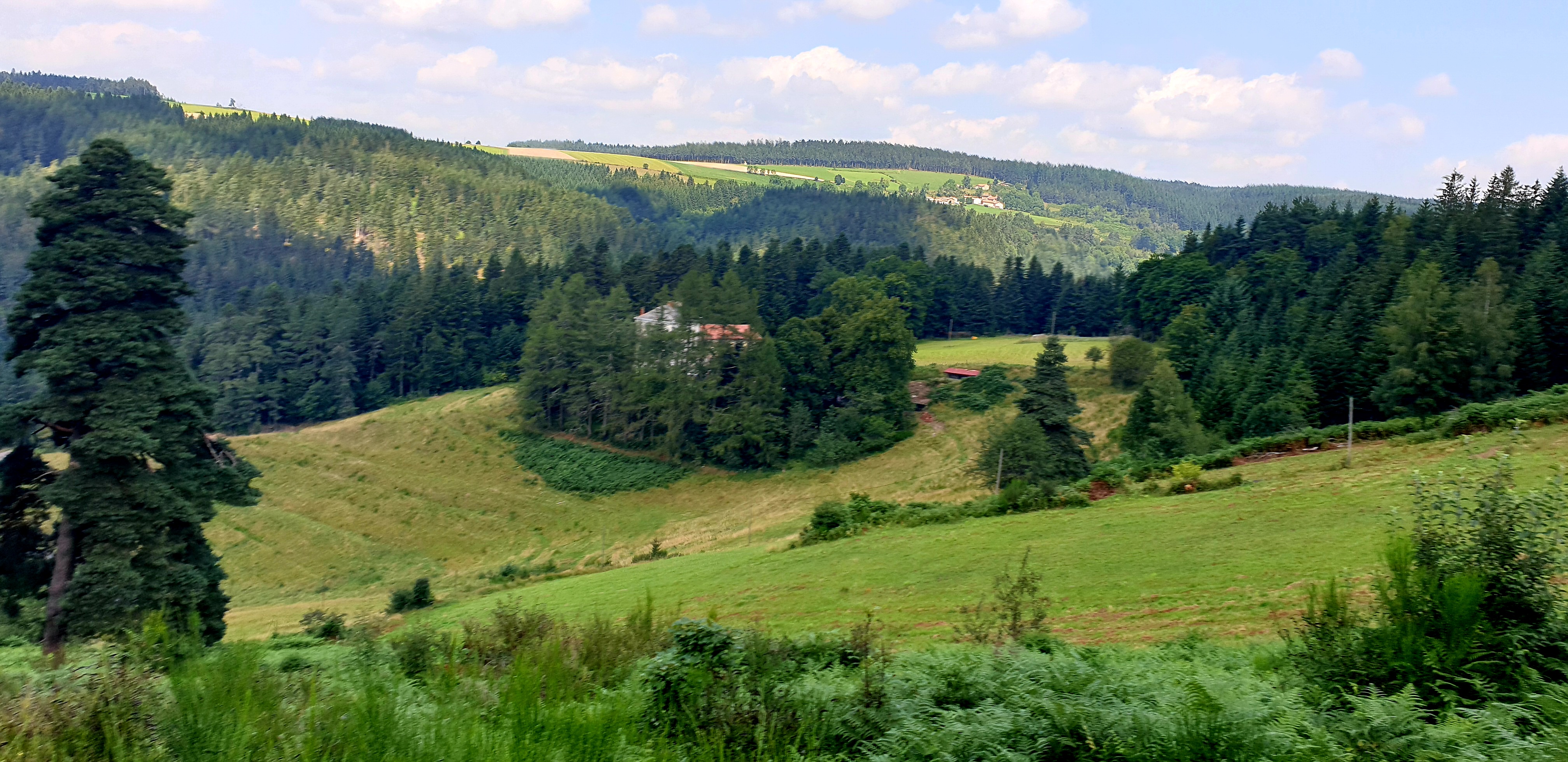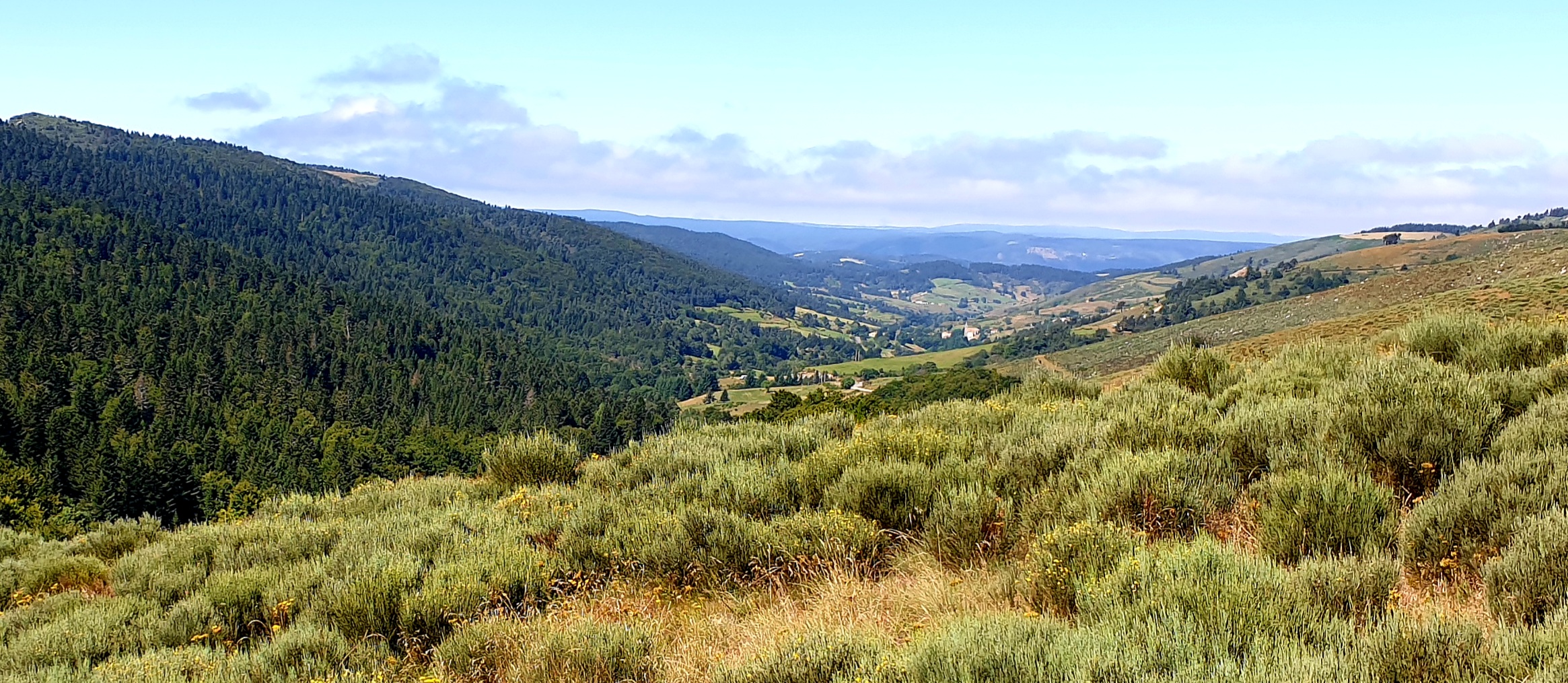Quittant Sainte-Eulalie, nous retrouvons le fil de la Loire, qui coule un bref moment vers le sud avant de redresser irrémédiablement son cours vers le nord. Puis notre chemin s’en écarte, grimpant, après avoir côtoyé un enclos de cabanes dédié à l’élevage de pintades, sur des versants forestiers. Un regard en arrière révèle Sainte-Eulalie dans les lointains déjà, sur le flanc sud de l’ensemble basaltique du Mézenc et des sucs qui le parsèment. Des sentiers tournicotant au sein de forêts épaisses et silencieuses nous amènent sur la ligne de partage des eaux, entre Méditerranée et Atlantique. Après la pause de midi, c’est une longue cavalcade plus dégagée, entre prairies et bois, jusqu’à la plongée finale sur le bassin de Lanarce.