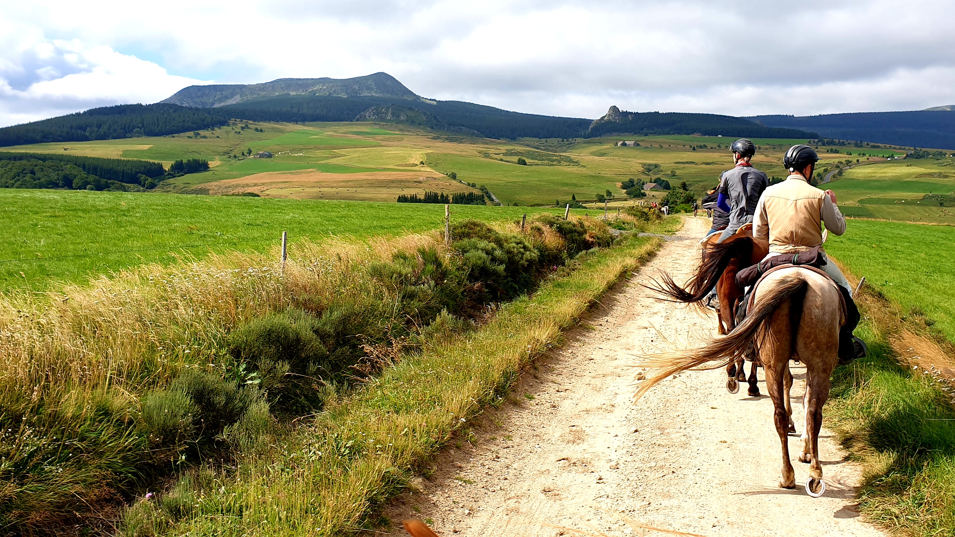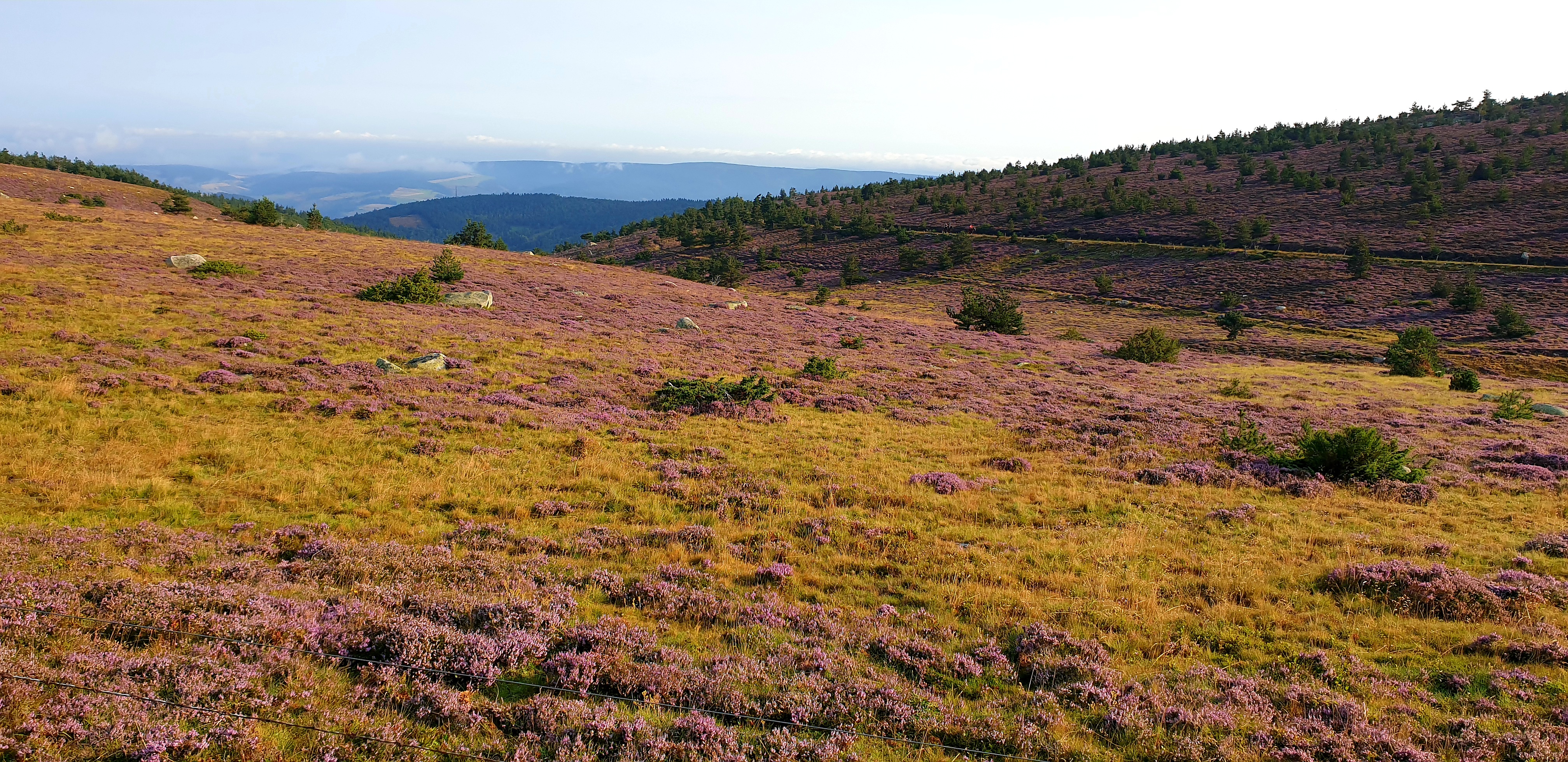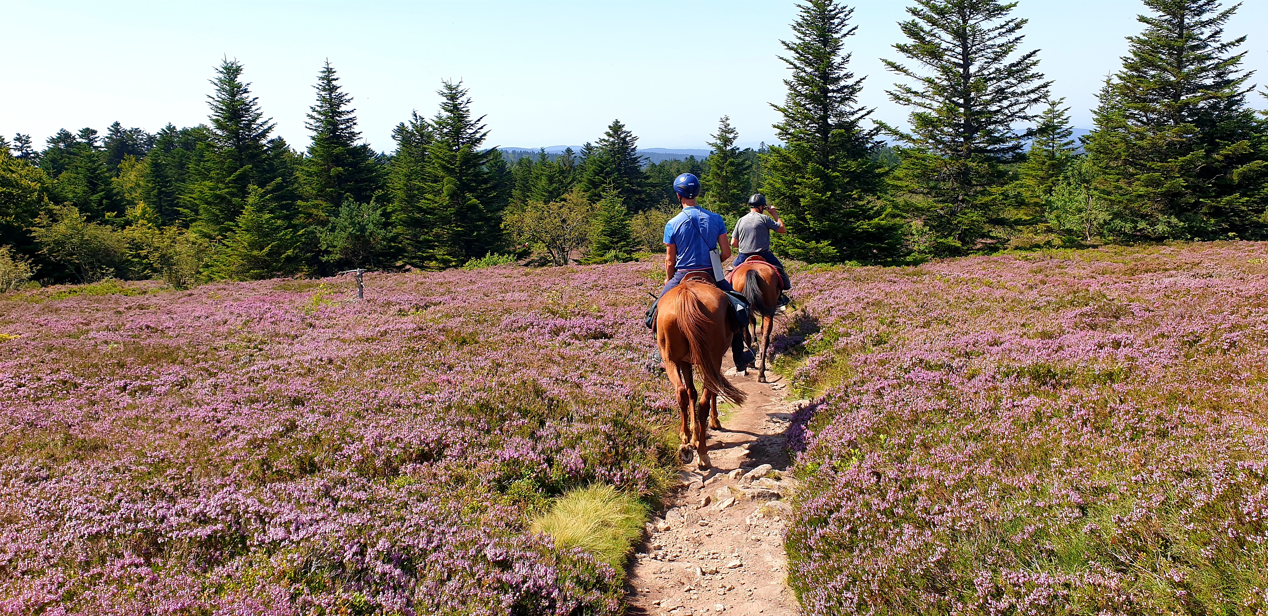 La montée aux sommets du Pilat s’effectue sans guère de transition. Une fois franchis les premiers coteaux par de bons chemins, la rudesse des pentes l’emporte, accentuée par le délitement des vieux chemins empierrés qui s’éboulent sous les sabots. Une dénivellation de près de mille mètres est absorbée pas à pas dans la matinée, jusqu’aux landes couvertes de bruyères épanouies qui bordent le Crêt de la Perdrix (1432 m). L’ascension a été à peine interrompue par une brève halte à la Jasserie du Pilat, jadis refuge doté d’un clocher pour guider les voyageurs égarés, où Jean-Jacques Rousseau aurait fait étape, et aujourd’hui haut lieu de sortie des stéphanois qui viennent jusque-là par une route en cul de sac. La crête franchie laisse place à un plateau ondulé et verdoyant, où les allures peuvent être plus rapides. Nous descendons doucement par bois et prairies jusqu’au col de la République, où passe la route qui relie Saint-Etienne à Valence, puis nous poursuivons jusqu’au centre équestre des Ecrinelles, lové au sein de prairies plantureuses, à proximité de Saint-Sauveur-en-Rue.