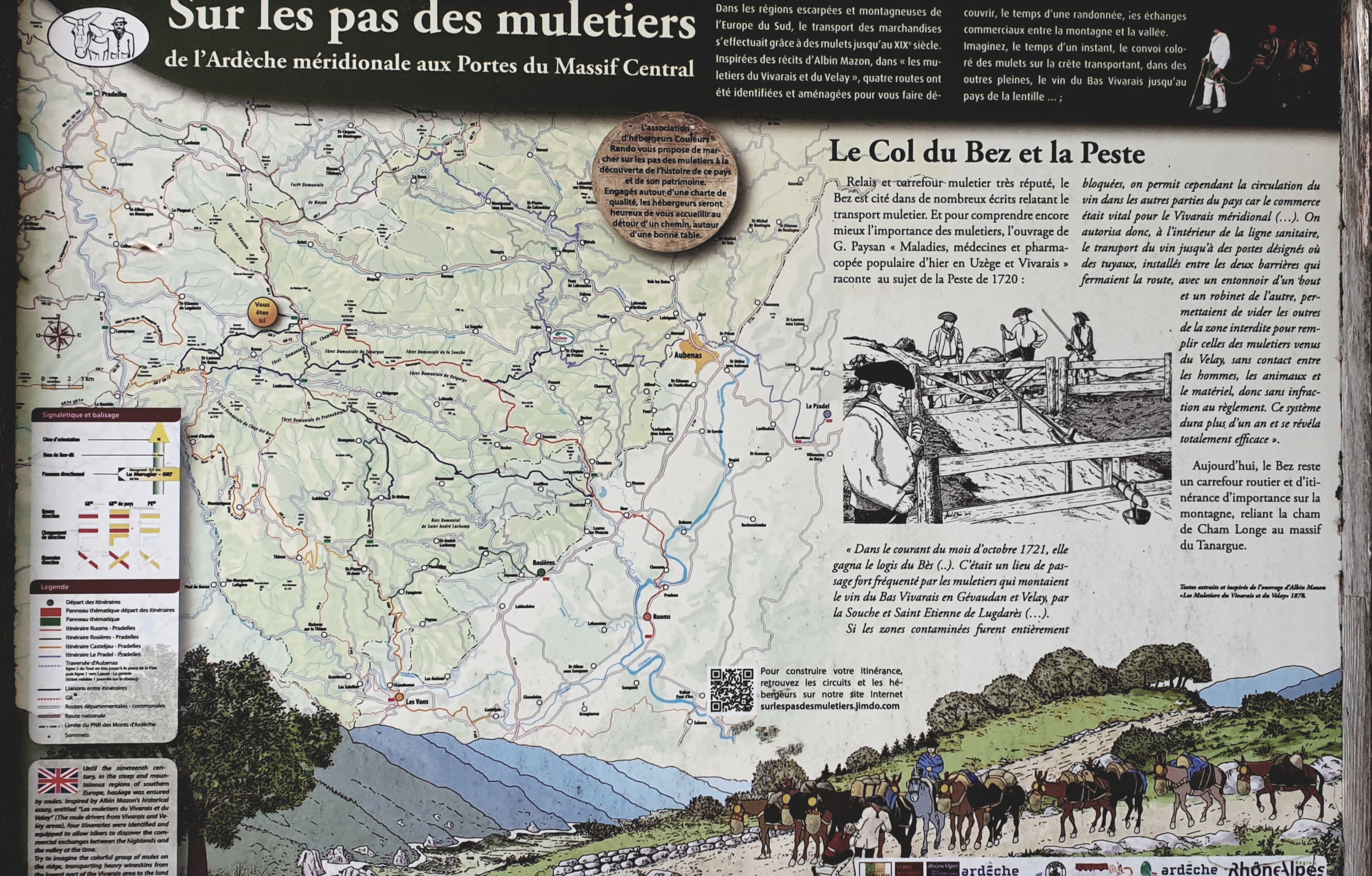 Depuis Lanarce, droit au sud, une longue remontée par vallons et crêtes, conduit, après une franche descente, au col du Bez, entre Vivarais et Cévennes. Au col, un panneau raconte comment le commerce du vin, transporté par les muletiers depuis le bas Vivarais, respectait, au temps de la peste de 1720-21, les contraintes sanitaires de l’époque par un ingénieux dispositif de tuyauterie afin d’éviter les contacts directs. Passé le col, en obliquant à l’ouest, une rude montée herbue nous amène de nouveau sur les crêtes, désormais rocailleuses et décharnées, aux allures de garrigue. C’est l’entrée en terre lozérienne. La lourde masse granitique du mont Lozère émerge à l’horizon, vue d’ici comme une longue table qui pointe vers le sud, en direction de la Méditerranée. La descente vers la Bastide-Puylaurent, premier village lozérien de notre chevauchée, longe le domaine de l’abbaye de Notre-Dame-des-Neiges, là où Stevenson fit un séjour mémorable dont il parle abondamment dans son livre. De fait, la Bastide-Puylaurent est le lieu de convergence de son itinéraire avec le nôtre. Stevenson, qui ne disposait que d’un simple âne bâté et non pas des valeureux chevaux randonneurs de Sommant, partit du Puy-en-Velay, plus au sud que notre point de départ, et emprunta une route un peu plus à l’ouest que la nôtre. Jean de Chatillon me fait observer que le récit pittoresque de Stevenson, devenu un classique de la littérature baroudeuse, aurait dû s’appeler « La souffrance de Modestine » car l’auteur en herbe n’a guère été tendre avec son âne, qui était une ânesse… L’Allier et la voie ferrée transitent par la Bastide-Puylaurent, village ainsi situé sur un axe bien tracé de communication nord-sud qu’empruntait aussi le chemin de Regordane. Nous bivouaquons sur la rive boisée de l’Allier, où les chevaux s’abreuvent sans retenue.