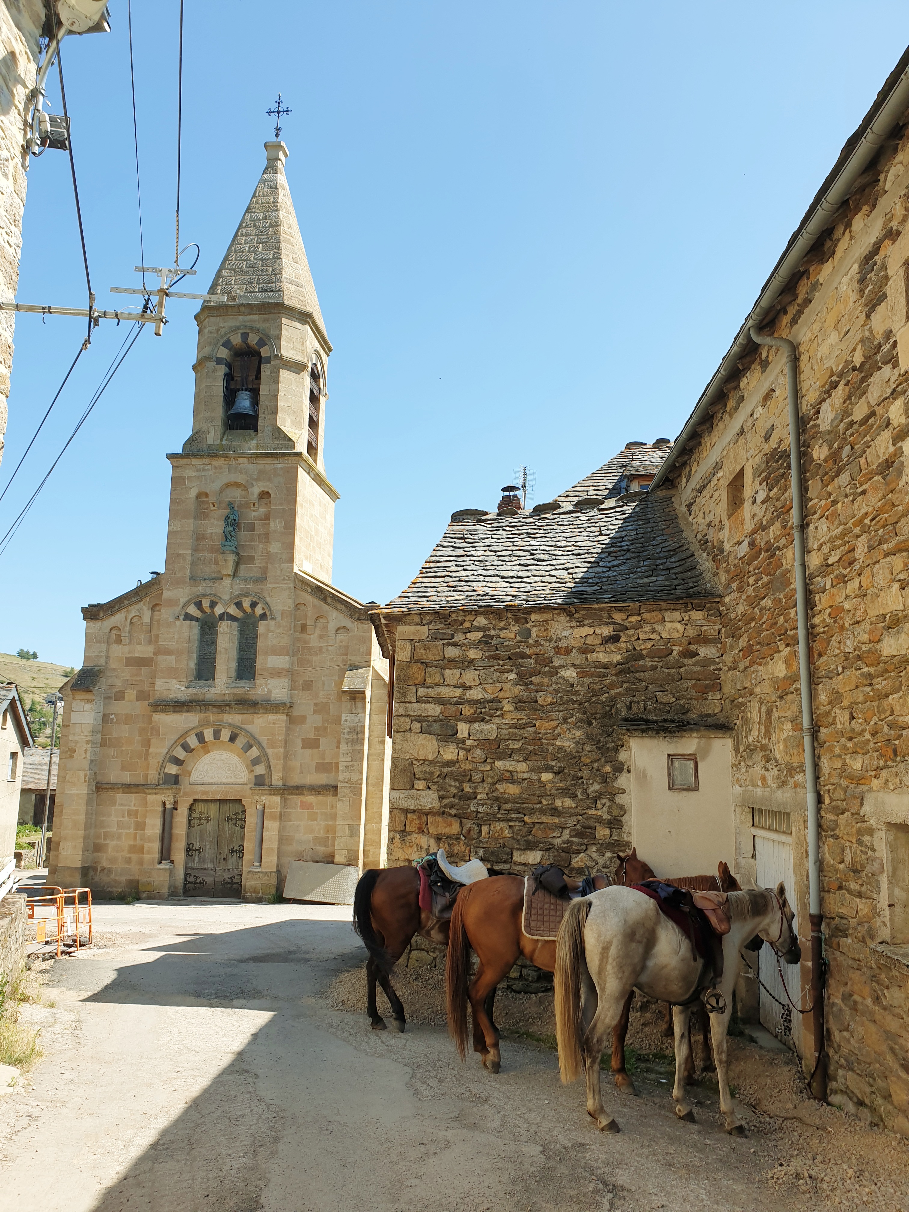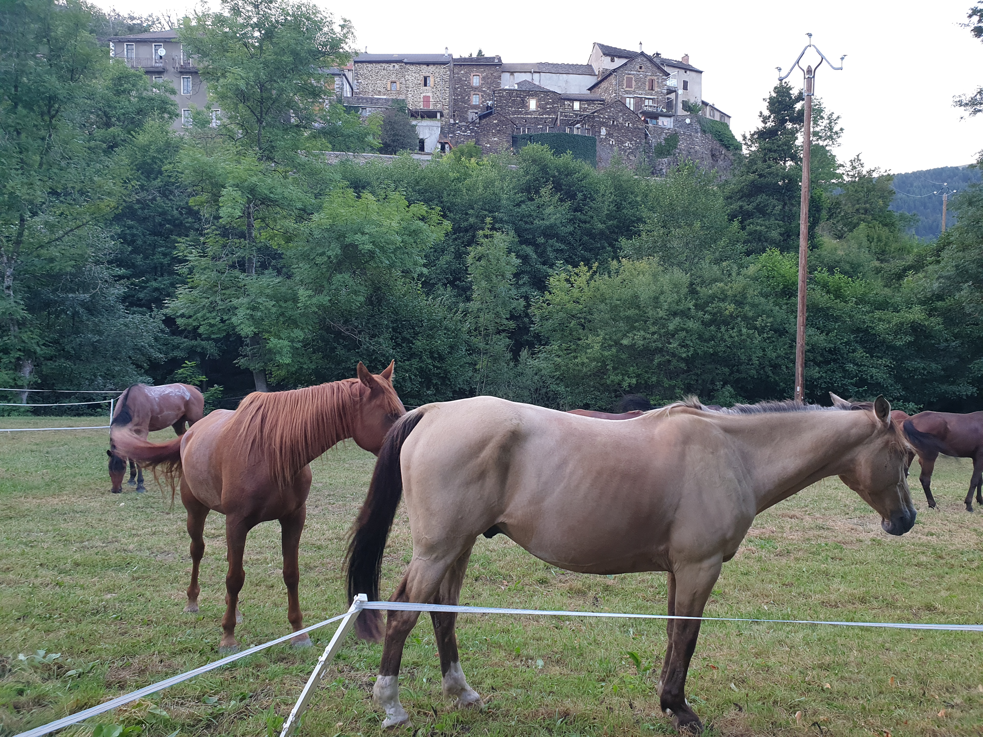 De nouveau, plein sud, en remontant un bref moment le cours de l’Allier avec une vue latérale sur le mont Lozère. Nous nous en écartons pour rejoindre un large chemin en balcon qui domine le village de Prévenchères et la haute vallée du Chassezac qui, lui, coule vers l’Ardèche et le Rhône. C’est un chemin de lave taillé à main d’homme, avec des encoches pour les roues des chariots (comme à Pompéi !). La résonance de la roche nue sous les fers incite à une allure prudente afin de les économiser. La tonalité méditerranéenne de la végétation s’affirme. Le tracé est accidenté, franchissant des ravines profondes, et oblige à mettre pied à terre pour guider les chevaux sur les sentes pentues et étroites, enserrées dans la garrigue. L’étroite vallée du Chassezac, encore torrent modeste, est traversée par une passerelle. Par des chemins plus roulants, c’est la remontée jusqu’à la Garde-Guérin, place-forte du XIIe siècle qui domine hautainement les gorges désormais plus impressionnantes du Chassezac. Elle était poste-frontière stratégique sur le chemin de Regordane, que nous empruntons pour une rude descente au lac de Villefort. Puis, longeant le lac vers l’ouest après avoir rejoint par une montée pédestre sans pitié une belle allée forestière qui le surplombe, nous abordons les contreforts du mont Lozère. Un chemin latéral permet d’atteindre, sur le flanc nord du mont, Altier, village austère au fond de la vallée de la rivière éponyme, qui s’en va alimenter le lac de Villefort. Le village parait protégé des frasques de la rivière cévenole par un surplomb suffisant. Chevaux et cavaliers bivouaquent en bordure de la rivière. Une baignade fraichement revigorante et presque vespérale clôt cette rude et chaude journée.