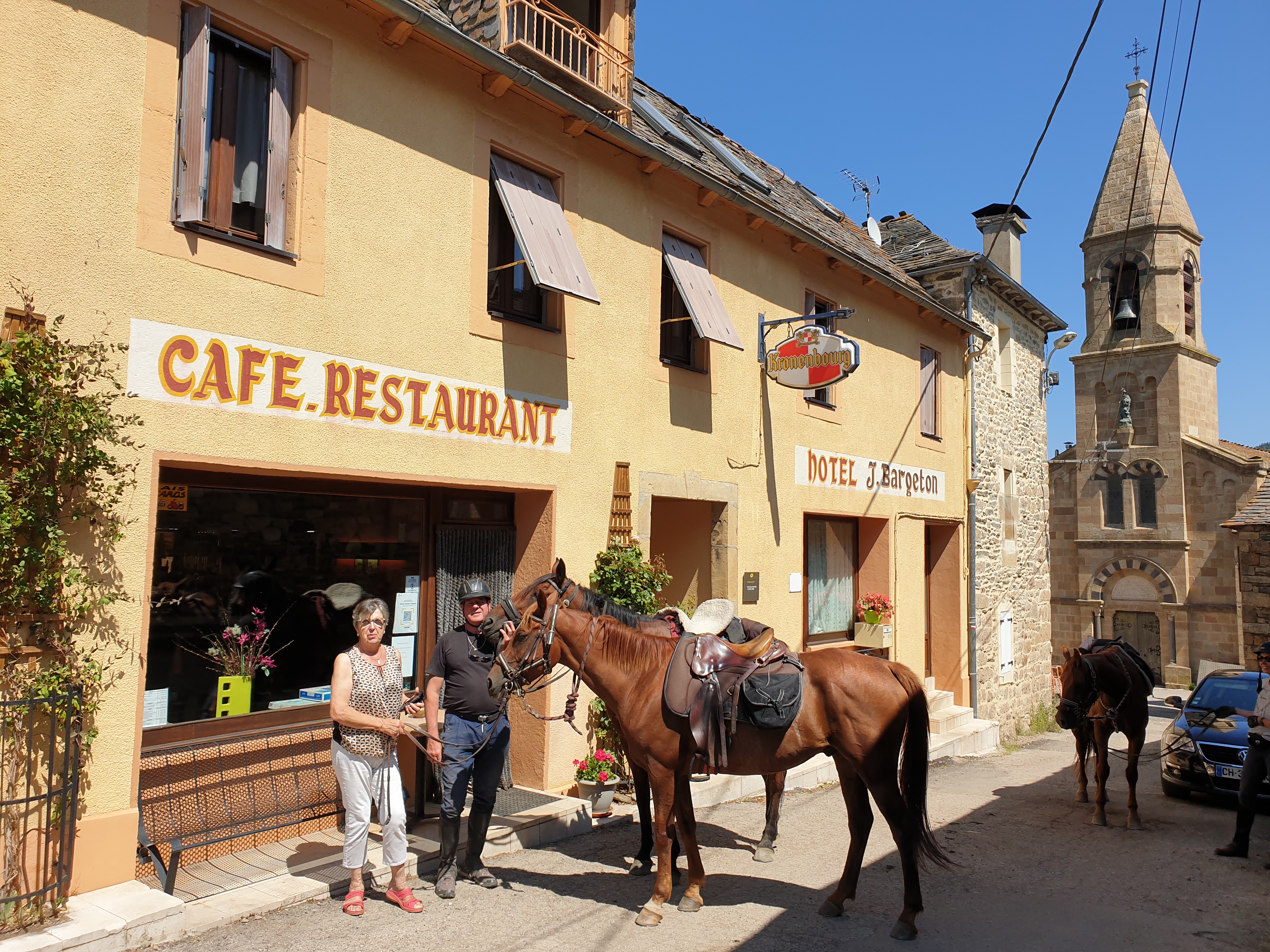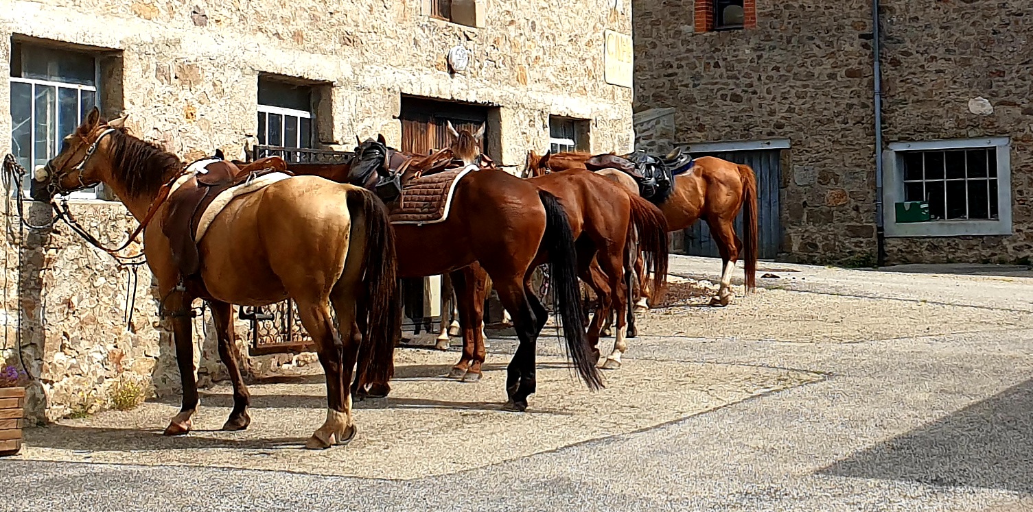 Nous partons à l’assaut tranquille de la masse imposante du mont Lozère par des chemins assagis. A mi-chemin, Cubières, village hospitalier pourvu d’une fontaine bienvenue pour les chevaux, dispose d’un bistrot qui accueille tout aussi bien les cavaliers. Nous tirons le portrait avec l’accorte aubergiste, avant la montée finale sur le plateau sommital, jusqu’au chalet du Mont Lozère et ses écuries. Les vastes étendues du plateau se déploient en éventail devant nous.