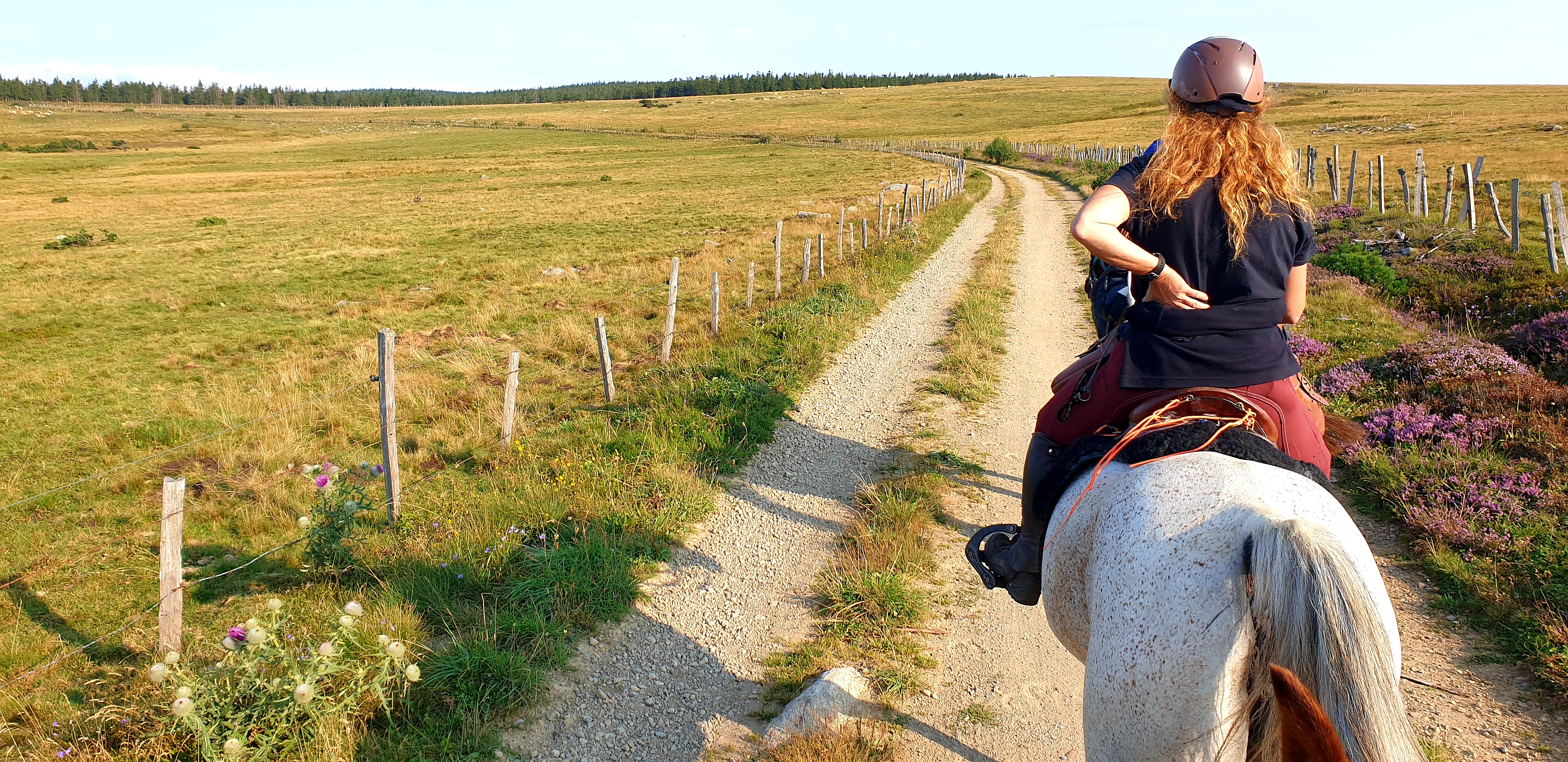 Nous galopons allègrement sur les chemins qui épousent les courbes de niveau des crêtes du Mont Lozère, à l’ouest du sommet de Finiels, laissé derrière nous : c’est la route forestière dite des chômeurs, ouverte dans les années trente du siècle dernier. L’immensité des estives et des landes fleuries nous accueille, jusqu’à l’étang de Barradon, dont le pourtour affiche une allure de taïga nordique. La descente vers Florac, via la cham calcaire des Bondons, parsemée de ses puechs marneux en forme de mamelons (cham, c’est le causse en occitan), est d’abord progressive puis plonge résolument dans la vallée du Tarn. La chaleur du fond de vallée nous absorbe et signe le terme de notre traversée cavalière des hautes terres.