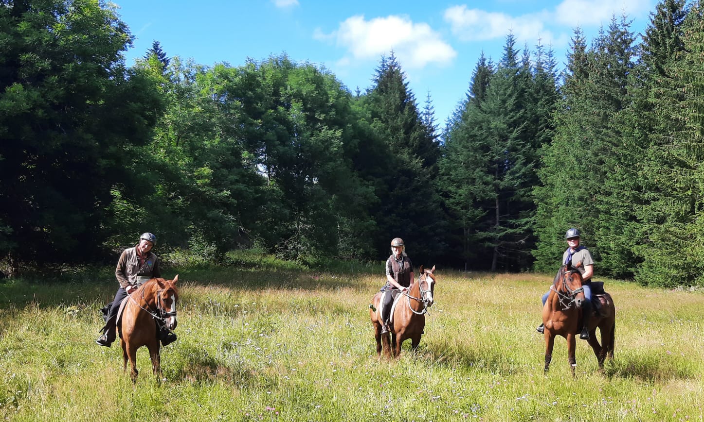 La transition est aisée vers le plateau altiligérien, parcouru de croupes densément boisées et entrecoupé de vallées encaissées. Si les occasions de halte rafraichissante ne sont pas trop nombreuses, elles sont accueillantes, pour les chevaux comme pour les cavaliers. La pause matinale prend une allure de saloon en plein air tandis que les chevaux apprécient en se délassant la prairie de la pause méridienne. Ce n’est sûrement pas une campagne surpeuplée mais, en cette période estivale, elle n’est pas non plus déserte : les rencontres diverses ne sont pas rares. Le soir, les chevaux baguenaudent dans les prairies de la douce dépression occupée par l’étang du moulin de Gorre, dans les alentours du village de Montregard et du hameau de Fours.